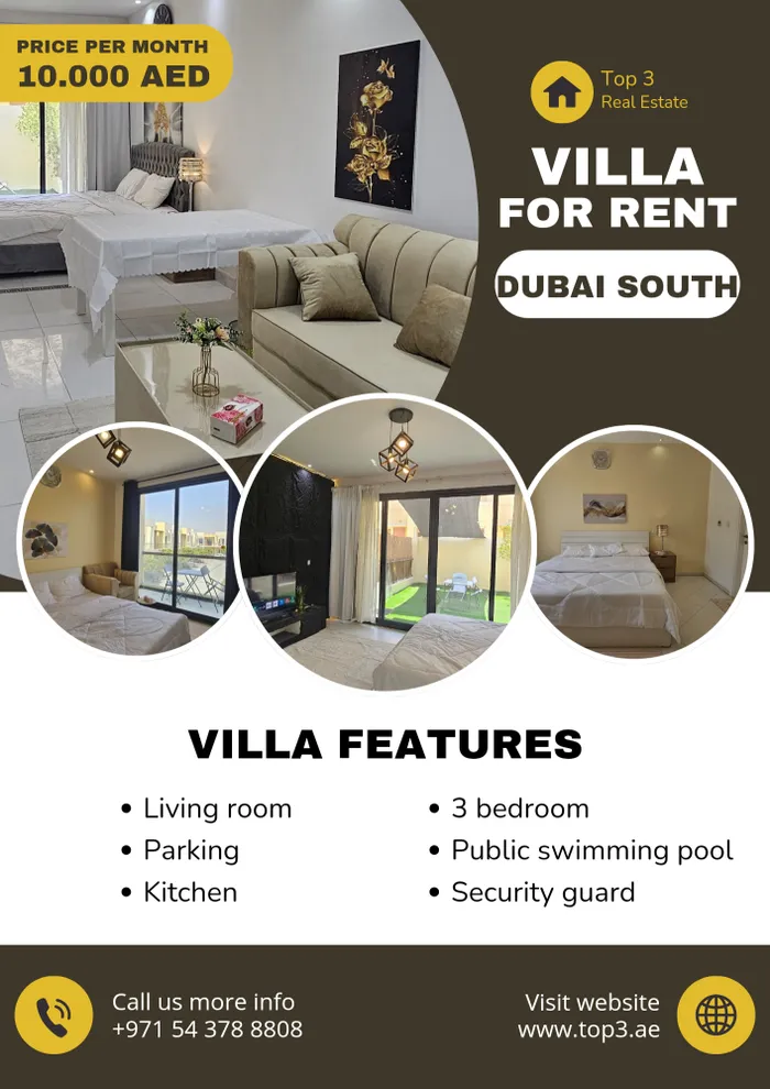 فيلا مميزة للايجار في دبي الجنوب جبل علي سيح شعيب2 مساحة 200متر مؤلفة من 3 غرف كورنر مفروشة بالكامل داخل مجمع آمن وسكيورتي 24 ساعة وشامل الخدمات موقف خاص ومسبح مشترك الدفع شهري 10 ألاف درهم او سنوي على دفعتين او ثلاثة